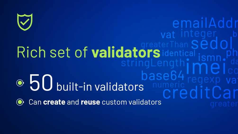 All validators can be used independently. So you can use it in browser, with JavaScript module and server side frameworks. Write the validator once and reuse it everywhere.